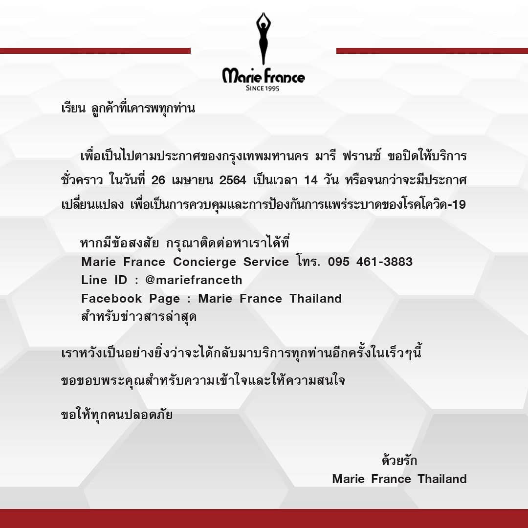 Naravee Clinic ประกาศปิดให้บริการ 14 วัน ตามประกาศกทม. แจ้งปิดพื้นที่เสี่ยง ตั้งแต่วันที่ 26 เม.ย. - 9 พ.ค. 2564 เพื่อลดการแพร่ระบาดโรคโควิด-19