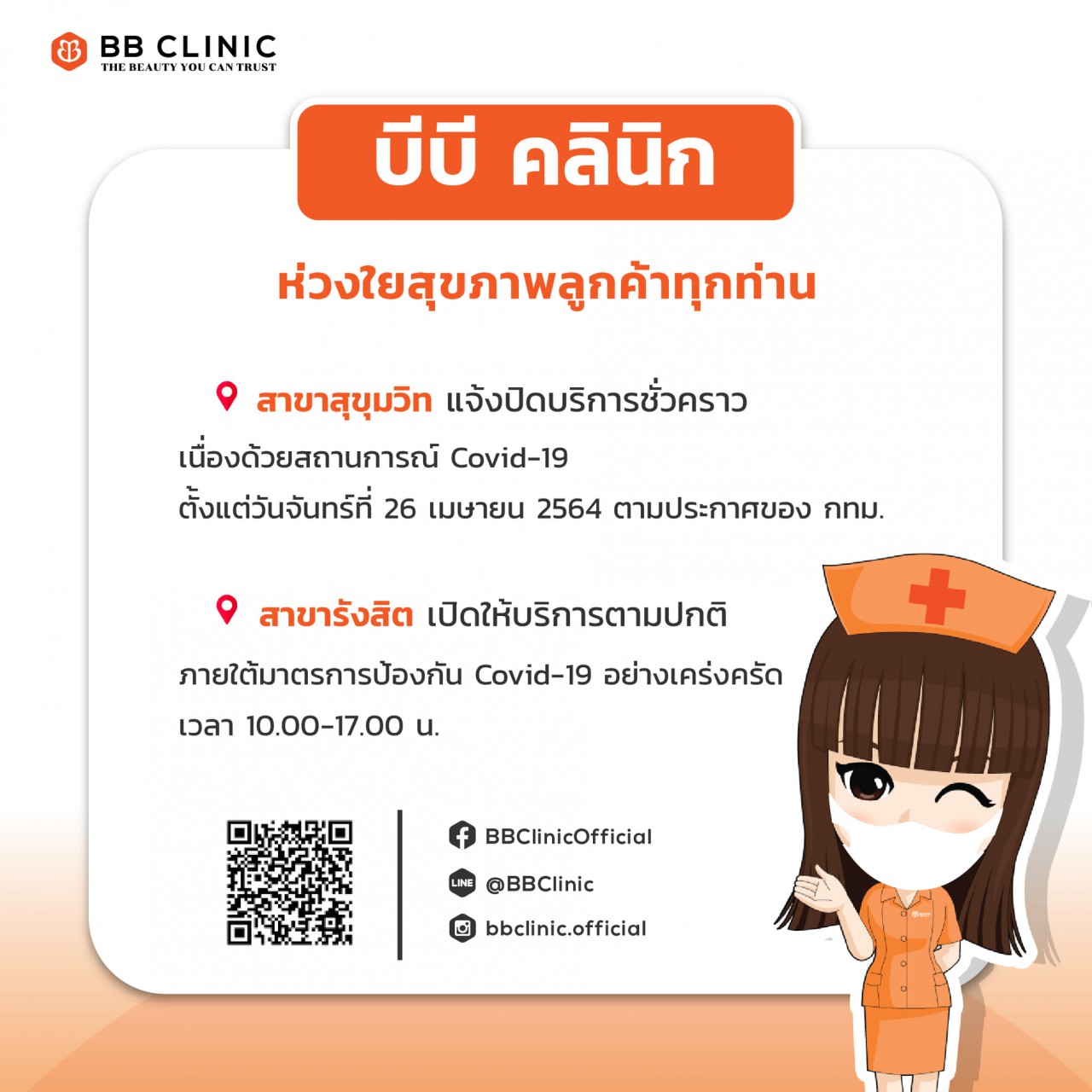 BB Clinic Official ประกาศแจ้ง ตามประกาศของกรุงเทพมหานครลงวันที่ 24 เมษายน 2564 บีบี คลินิก *สาขาสุขุมวิทปิดทำการ ตั้งแต่วันจันทร์ที่ 26 เมษายน 2564 เป็นเวลา 14 วัน
